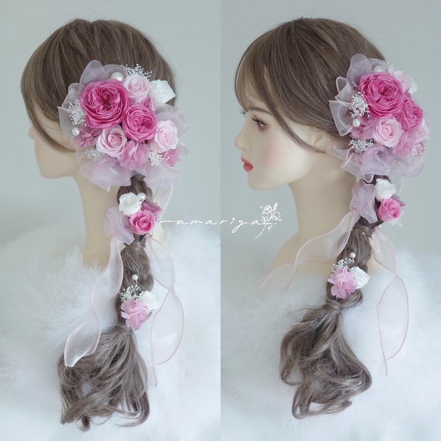 ローズや小花は自然素材に着色を施されていますため、その時々で色合いや形は微妙に異なります事、自然素材であります為ご了承くださいませ。