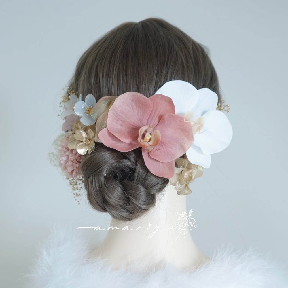 髪飾り 胡蝶蘭とホワイトゴールドアメリカンフラワー