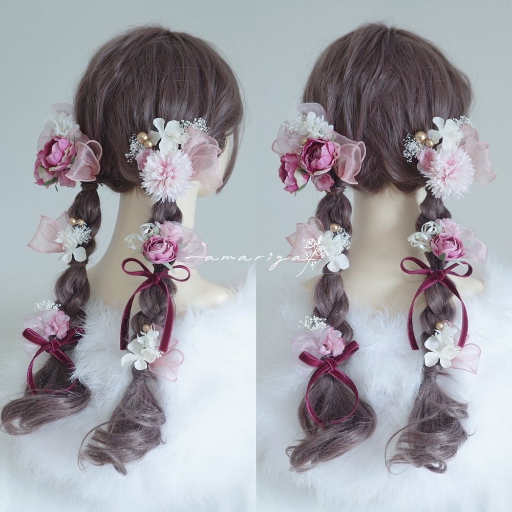 ツインテール用にふわふわとループリボンで可愛らしくご使用いただけますよう質感と色合いの違う2色のリボンを組み合わせています。