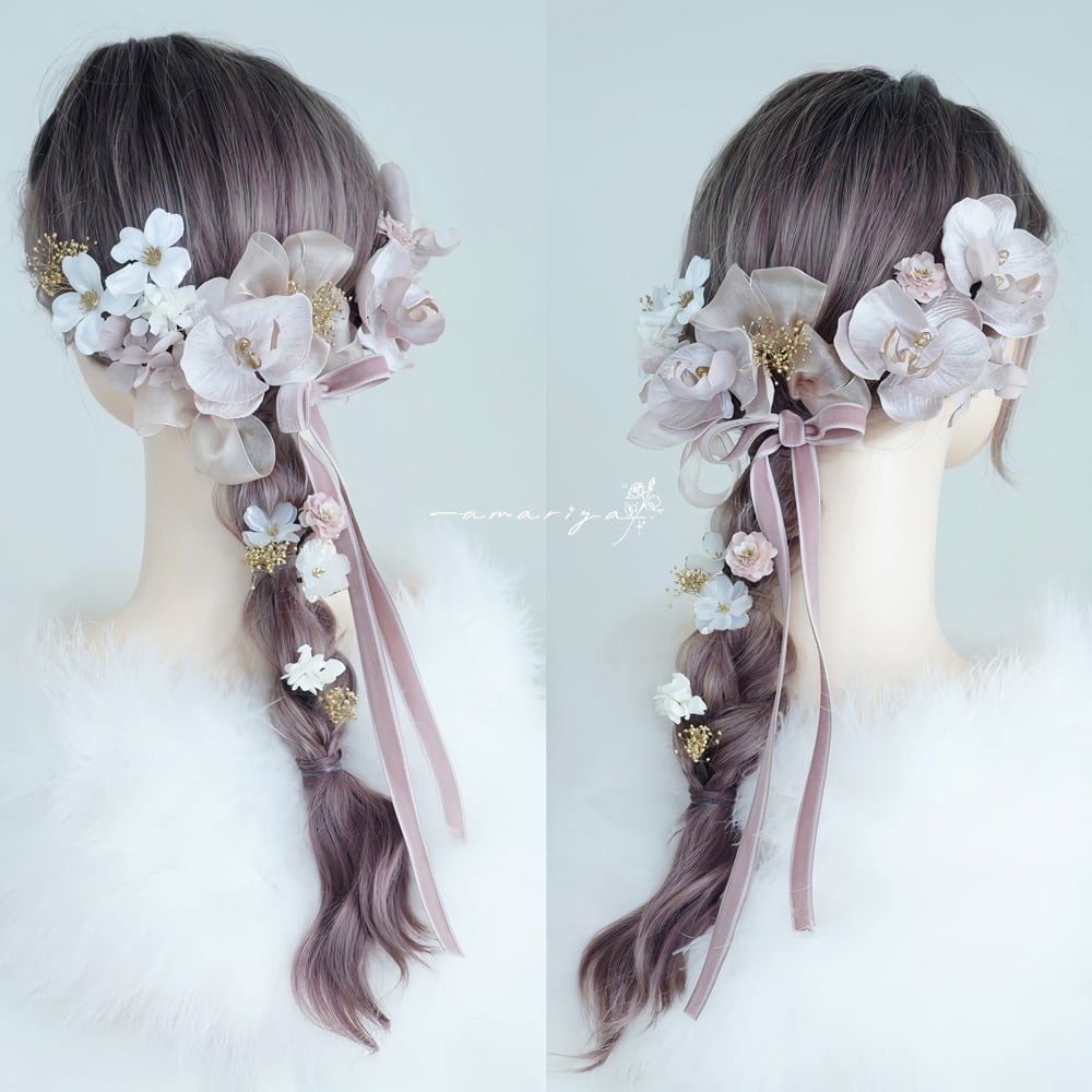 髪飾りベルベット胡蝶蘭3輪BEと桜