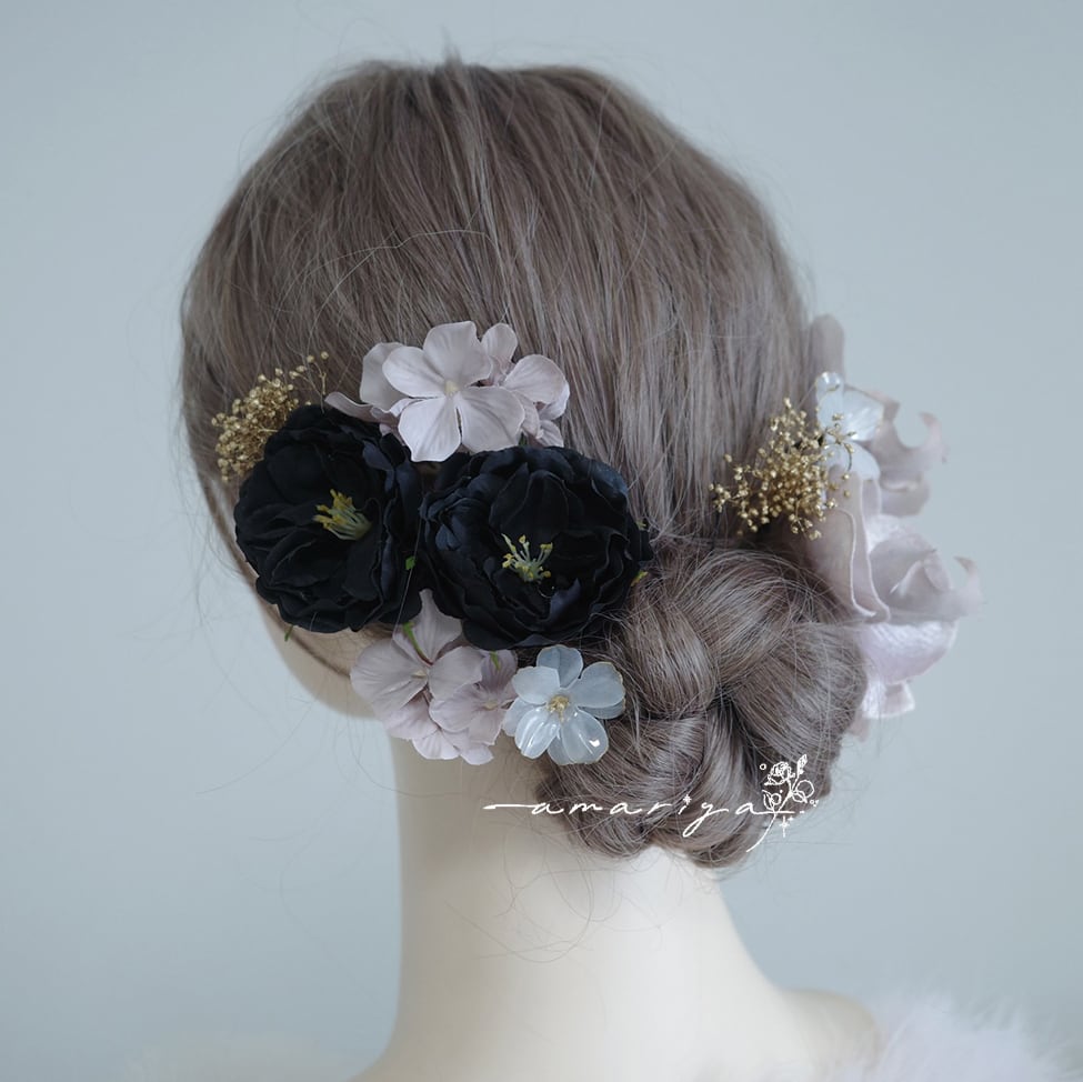 髪飾り ベルベット胡蝶蘭とブラックローズ