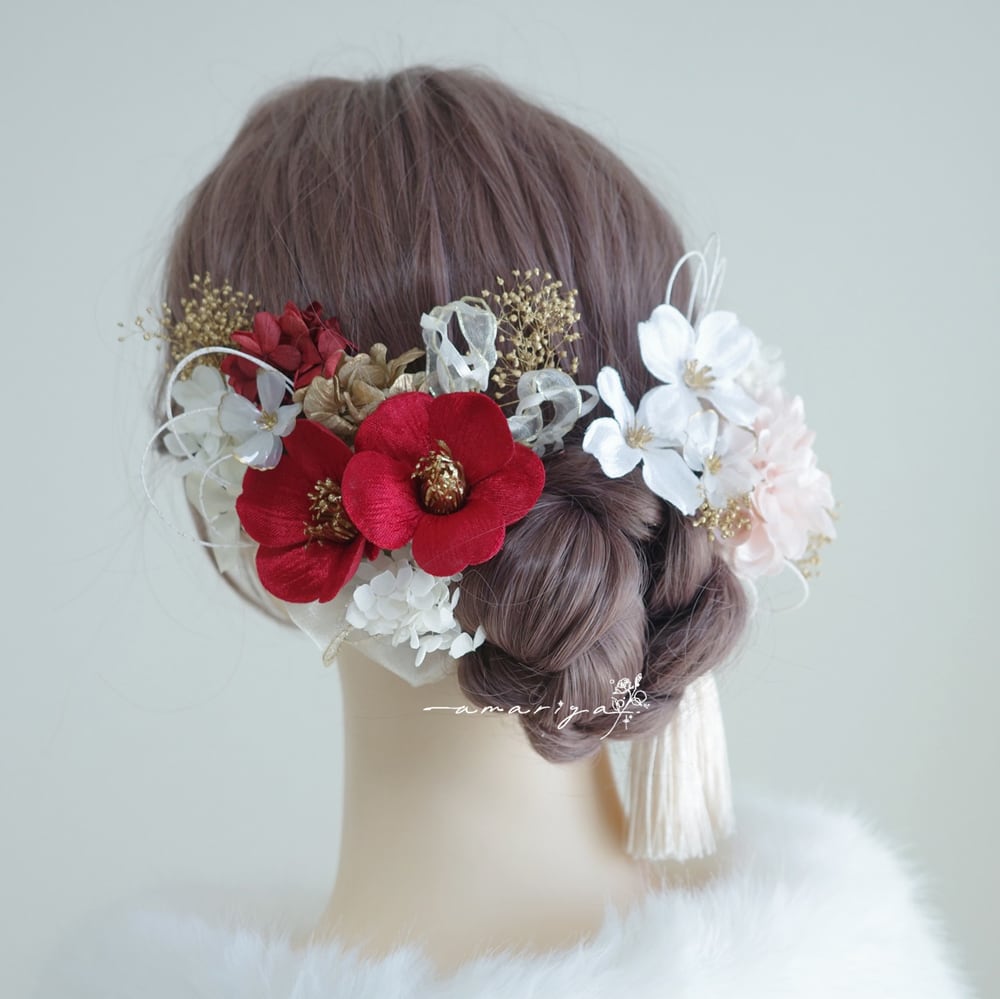 ベルベット素材の紅白の椿と桜が目を引くコントラストの映えるお写真映えする髪飾りです。