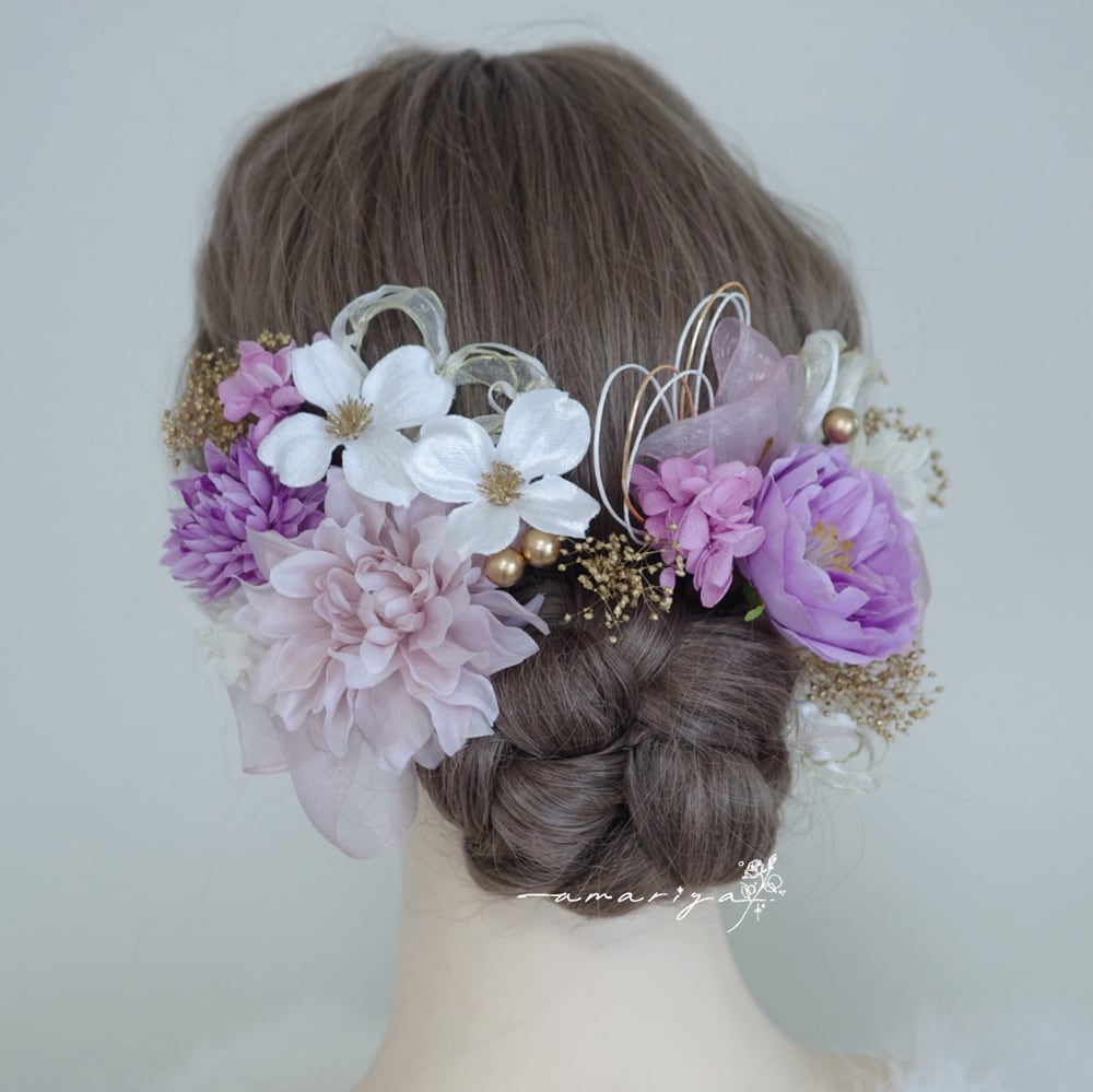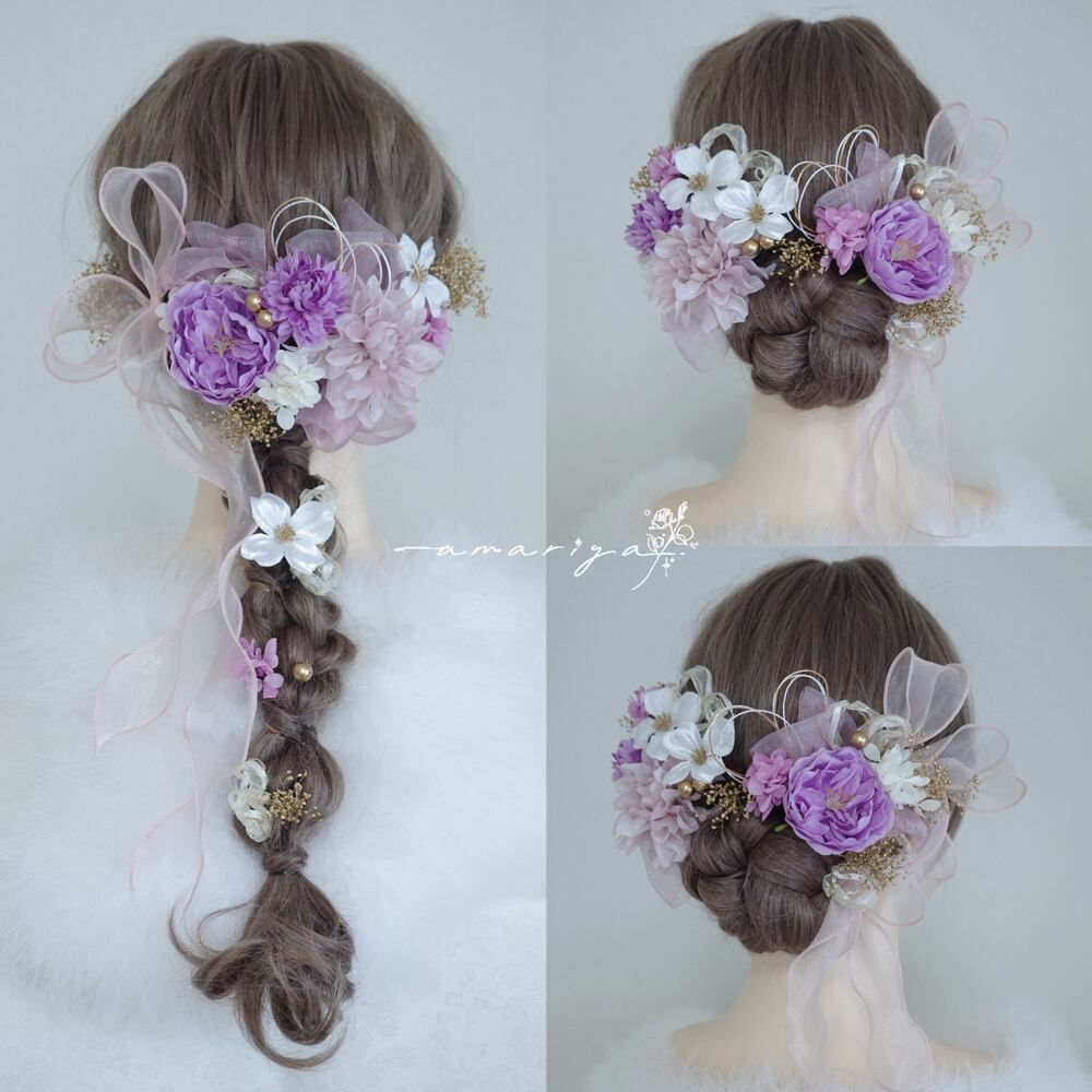 オールドローズのフリンジ感が可愛いライラック色のローズをメインに純白のベルベットの桜、水引やリボンとふわふわと華やかにご使用いただけるセットです。