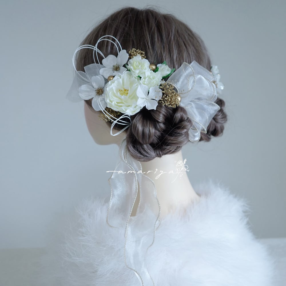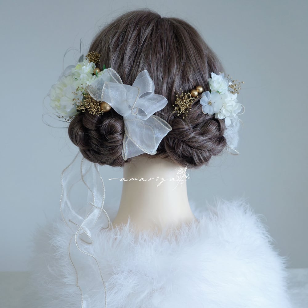 ふわふわとダブルループにしたリボンと裾用リボンなど、3本に分けてお作りしていますので、アップスタイル以外にも編み下ろしスタイルにも可愛くご使用いただけるセットです。