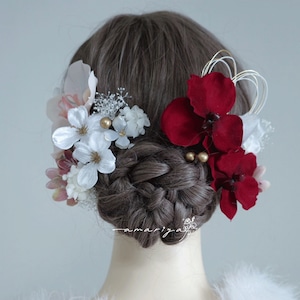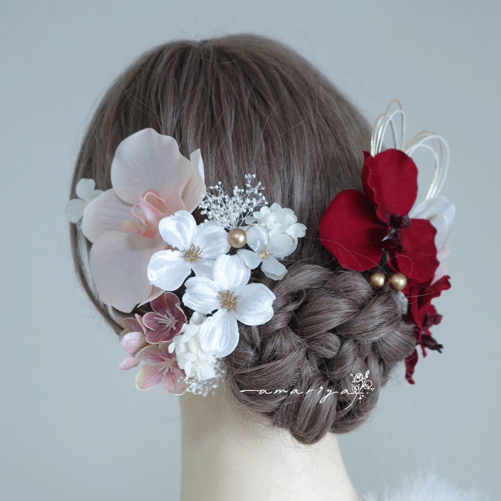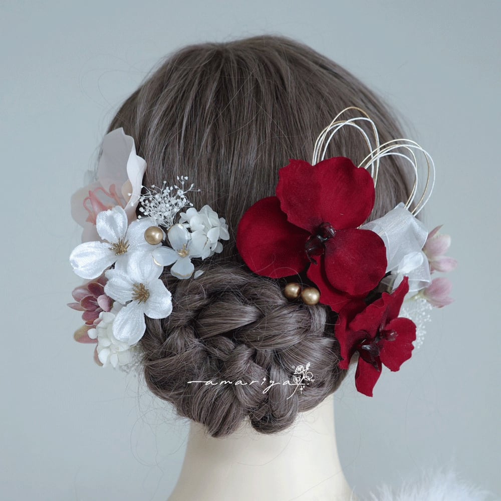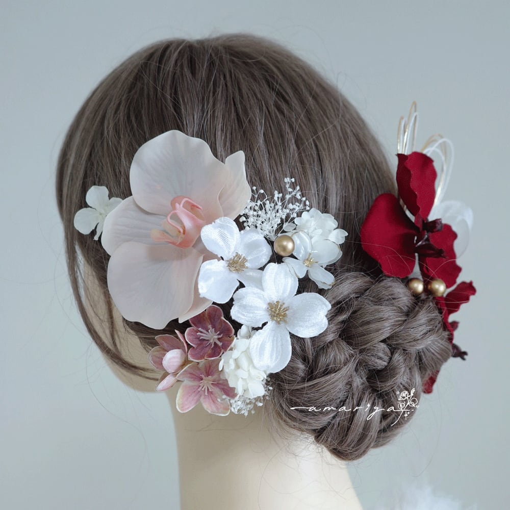 ベルベット素材の真紅のオーキッドとホワイトの桜に淡いピーチピンクの胡蝶蘭を合わせていいます。