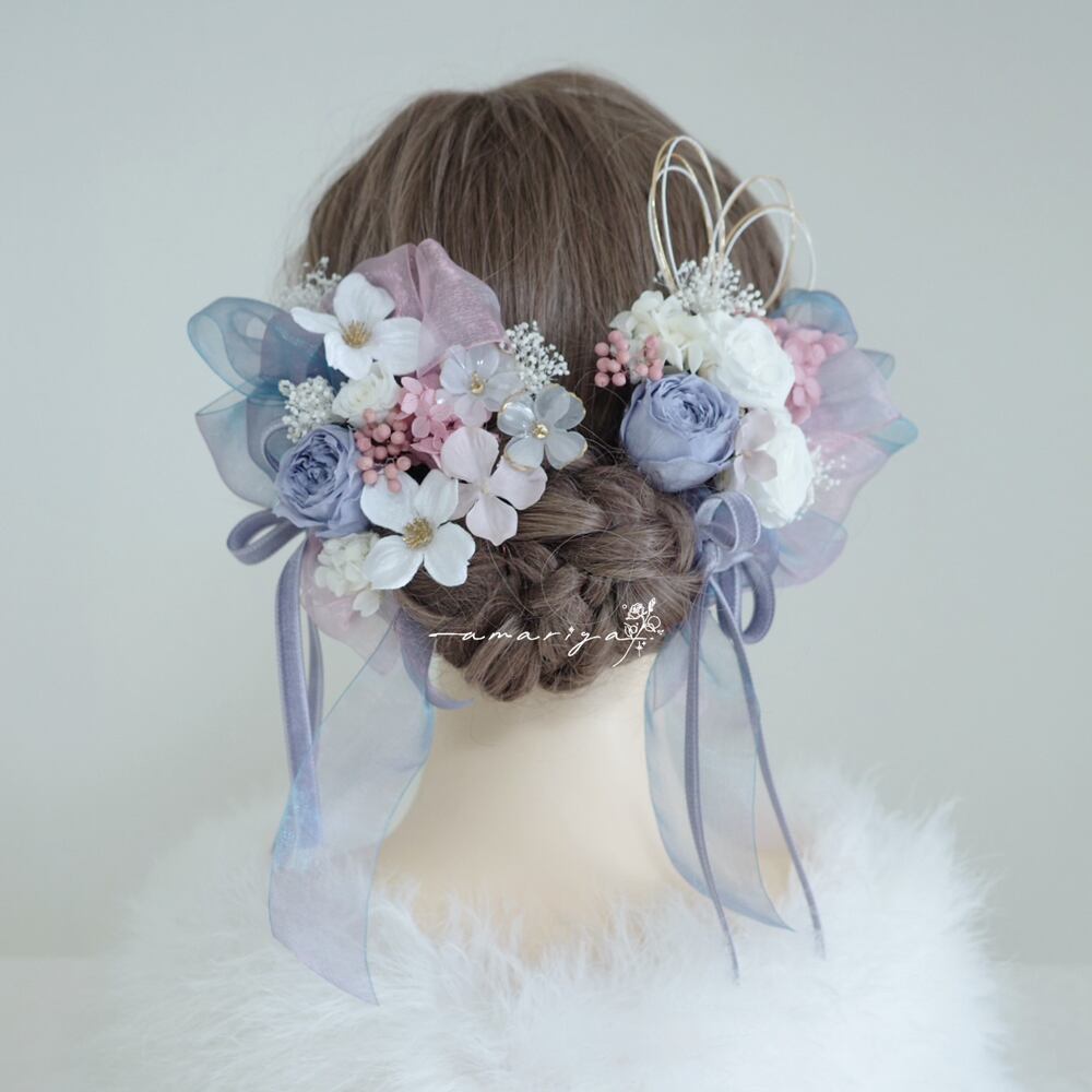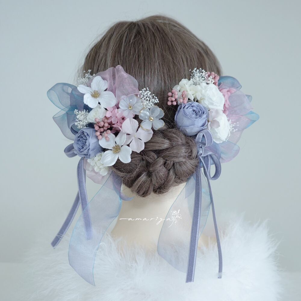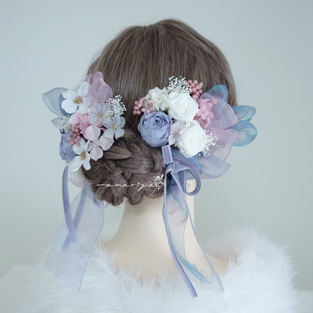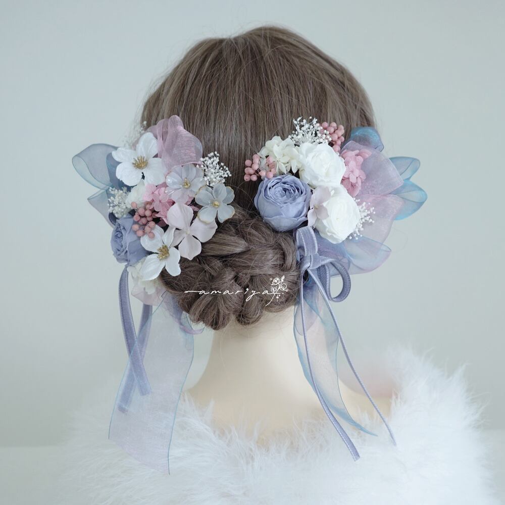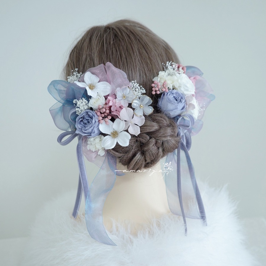 髪飾り プリザーブドローズくすみブルーと桜