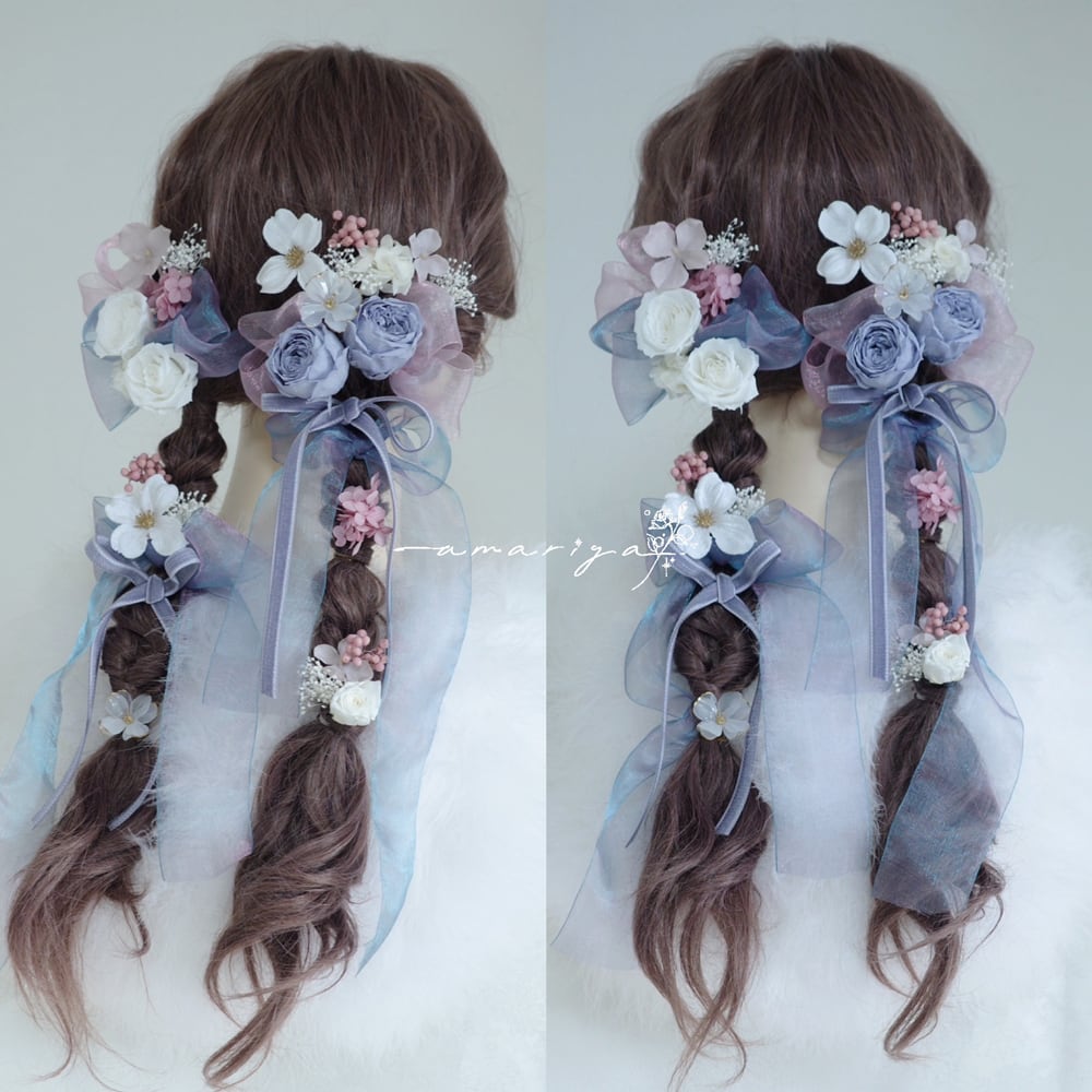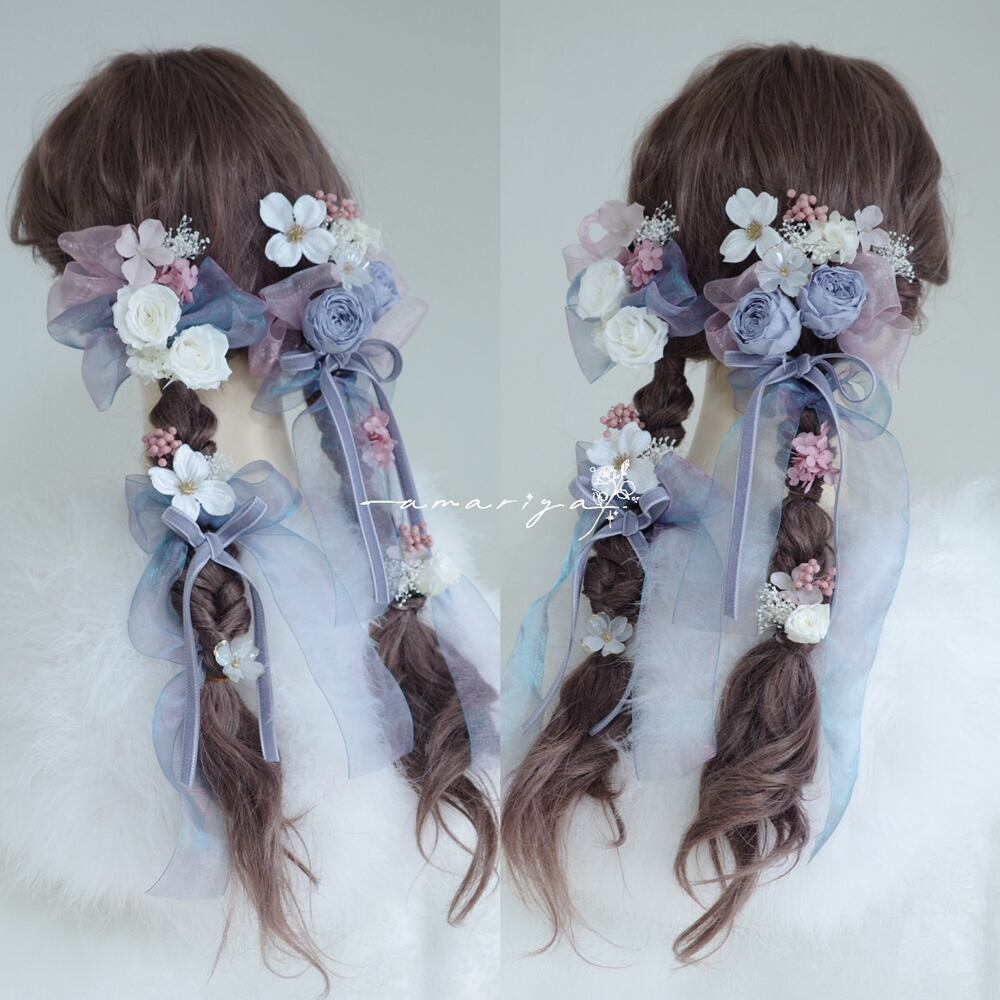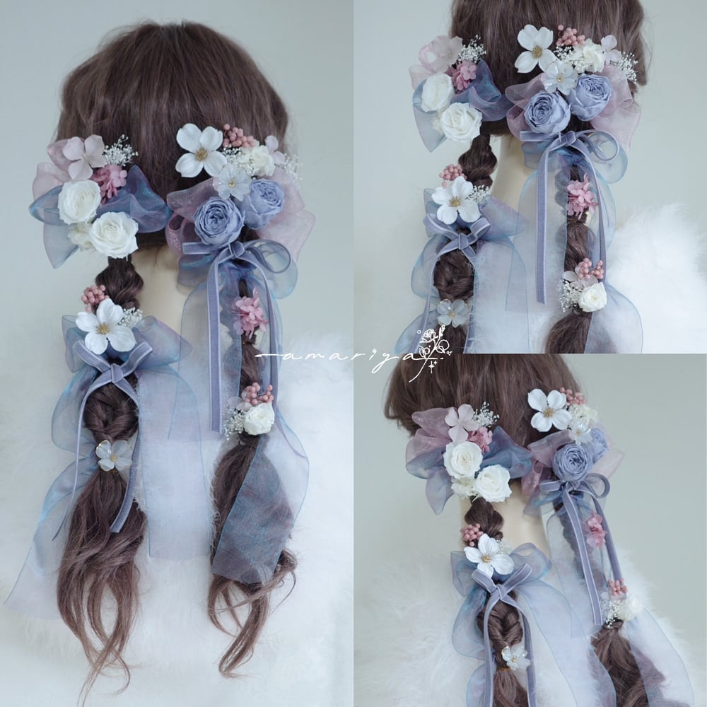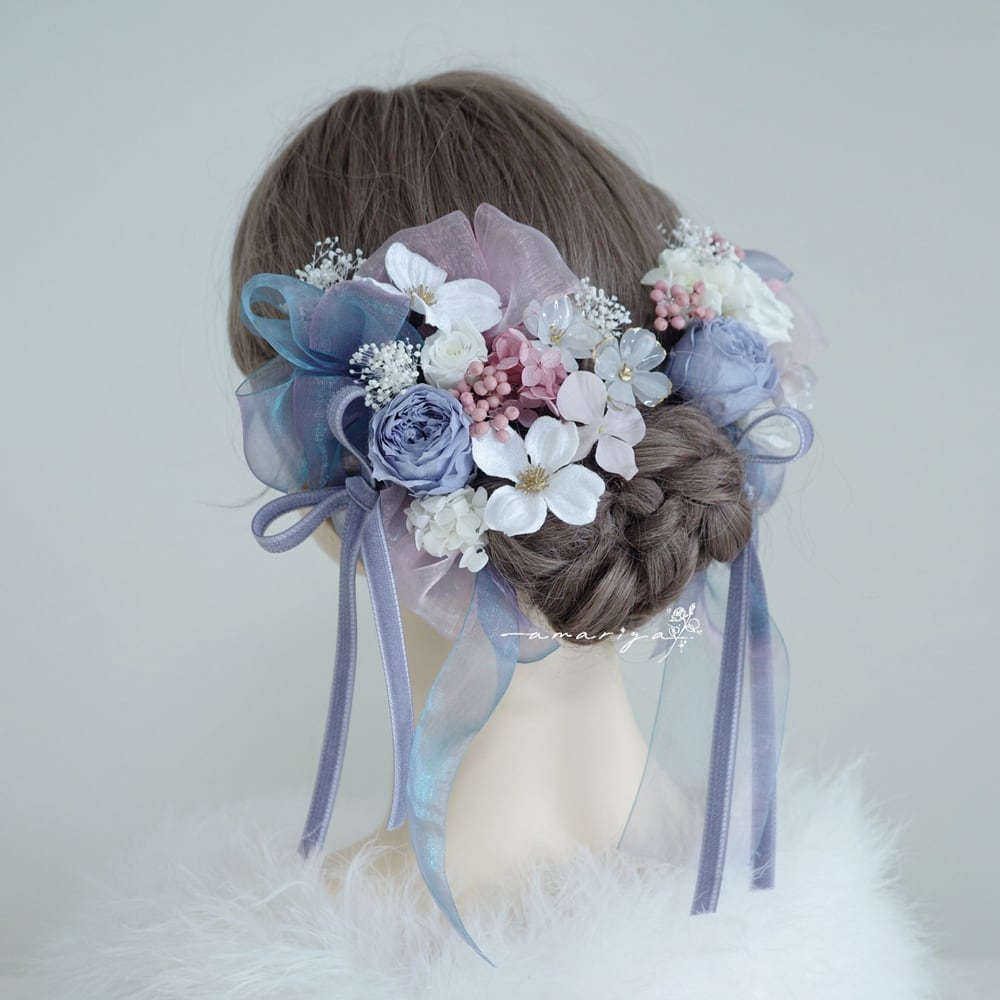 髪飾り プリザーブドローズくすみブルーと桜