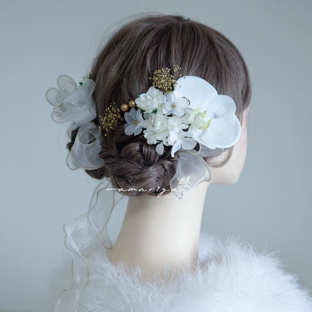 髪飾り 胡蝶蘭と八重咲クリームローズ