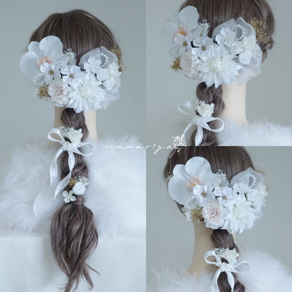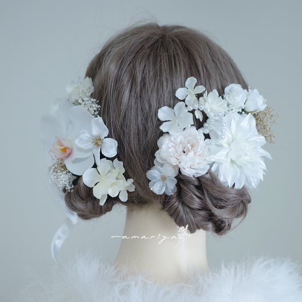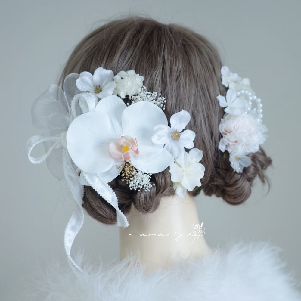 髪飾り 胡蝶蘭と2種のダリアとローズ